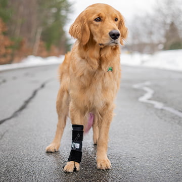It is constructed with lightweight materials to limit extra weight on your pet’s front legs. The long touch fastener straps provide additional support above and below the carpal joint.