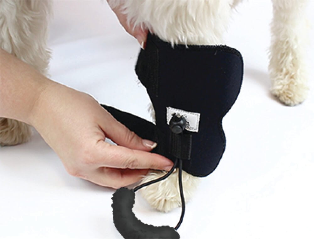 Your dog’s toes should not be lifted off the ground while wearing this product. If your dog is walking and the toes are not dragging, then the fit is correct. If your dog is still able to drag the toes when wearing the product, you will need to tighten the cord.
