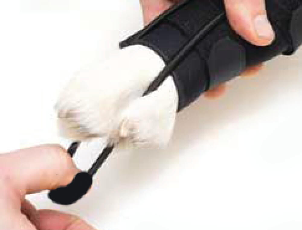 3. Place cord loop around and under middle two toes. Soft fleece should always be closest to dog’s paw, touch fastener side should face the ground to avoid irritation.