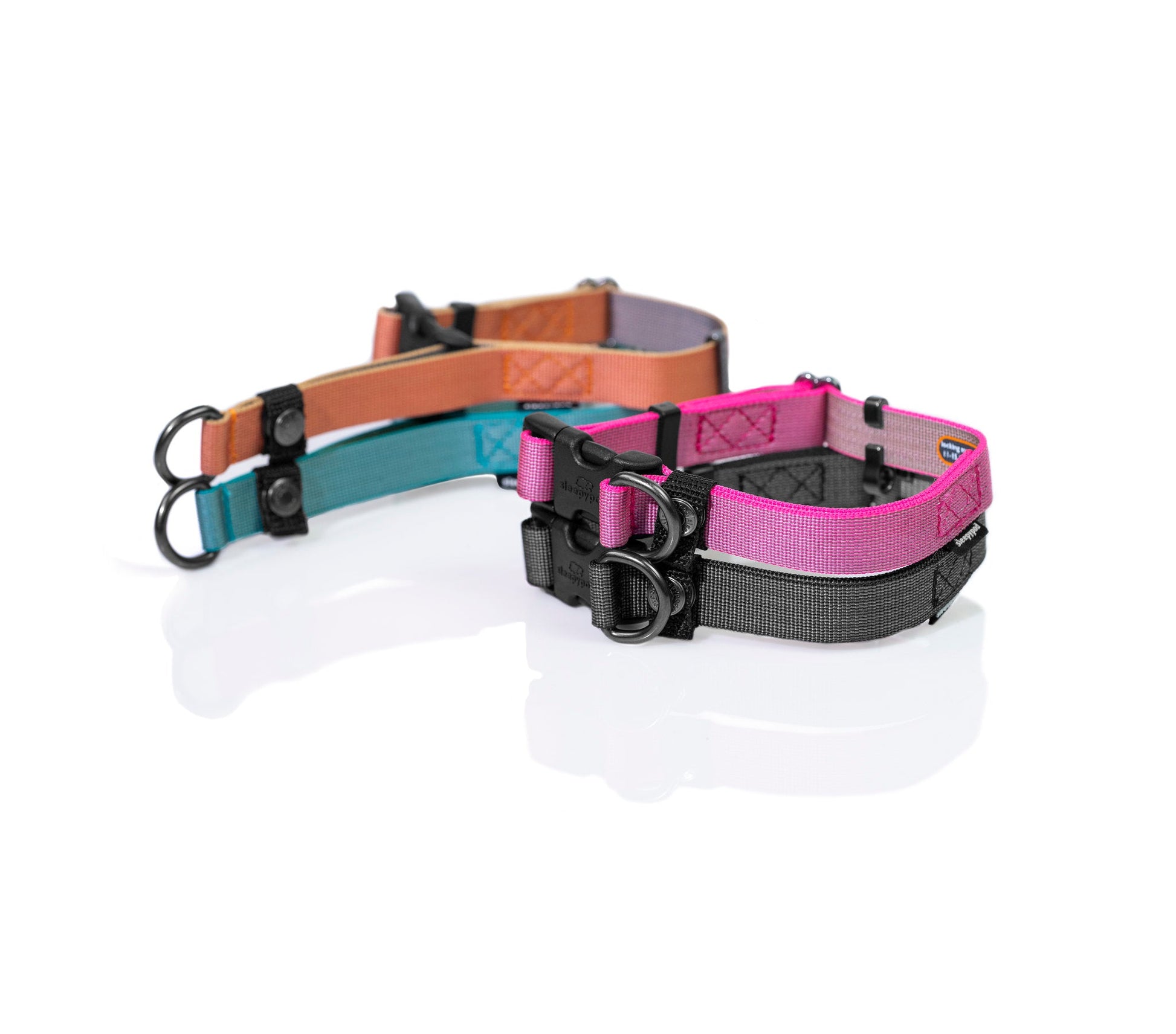 Unique collar design cinches to provide the gentle control and security of a martingale collar yet can be securely fastened for off leash use so there is no need to swap to an everyday collar for identification purposes at the dog park, traveling, or even at doggy daycare. The martingale collar is the preferred collar of dog trainers for its gentle control to help distract pulling. Prevents a pup from backing out of the collar when in martingale mode. The supple and smooth nylon collar is washable and conforms to the neck comfortably. High-strength slide buckle and metal hardware. Chromaweave contrast webbing for a pop of color. Includes detachable identification tag holder.