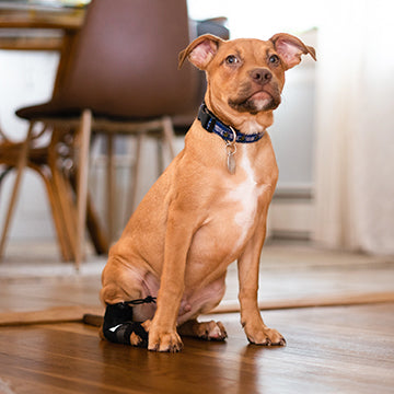 The training sock is lighter weight and will train your dog to lift their rear leg and paw higher, improving their knuckling. For dogs who drag their paws in between training sessions, the Bootie Splint can be worn to protect the paw.