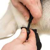 Place cord loop around and under middle two toes. Soft fleece should always be closest to dog’s paw, touch fastener side should face the ground to avoid irritation.